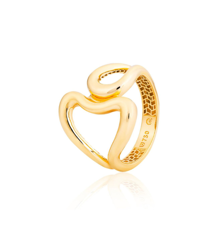 O Anel Coração Vazado Uni em Ouro 18K traduz o amor em sua forma mais essencial. O acabamento polido realça a fluidez do desenho, criando uma peça contemporânea que materializa sentimentos com elegância.